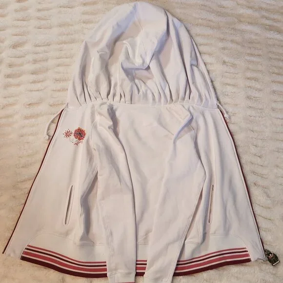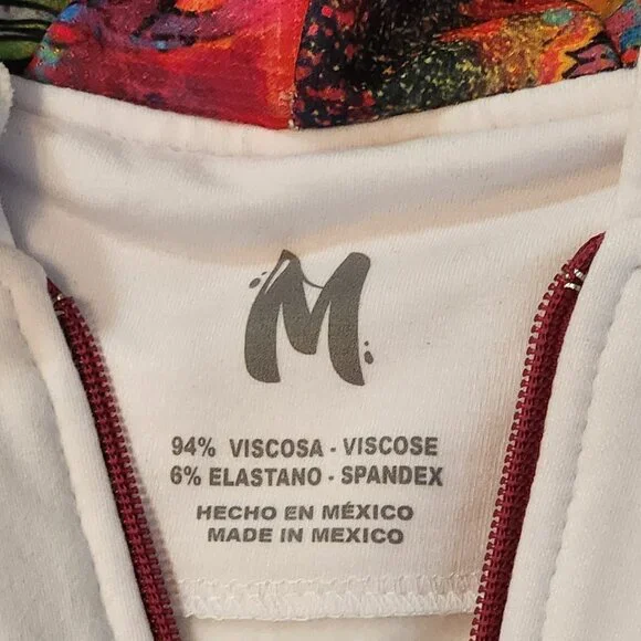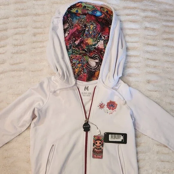 ¡Ay Güey! Hoodie Zip-Up Jacket (Medium)* 94% Rayon (Viscose)* 6% SpandexCondition: NEW, RETAIL TAGGEDNote: Never usedThis is a white zip-up hoodie jacket by ¡Ay Güey!, a premium Mexican lifestyle fashion brand known for vibrant, cultural, and artistic designs incorporating Mexican heritage into contemporary fashion. The jacket features:Key Features:* Exterior: A white base with embroidery on the left chest area showcasing colorful, floral, and heart-inspired art.* Interior Hood: A striking multicolored design with vivid, intricate patterns reminiscent of Mexican culture and art.* Zipper: A red zipper with a matching tag pull that complements the embroidery and stripes.* Pockets: Two front pockets seamlessly integrated into the jacket.* Hem & Sleeves: Accented with red and white striped ribbing, adding a sporty and stylish look.Rated: PG+You'll receive the product within the photos packaged nicely with care and concern... PLEASE EXAMINE THE PHOTOS! Remember, you can bundle items together to save on shipping.Check out our other store:* Bliss Blvd Shophttps://www.mercari.com/u/bliss_blvd_shopPlease get in touch with us if you have any questions... Thank you for being so interested!