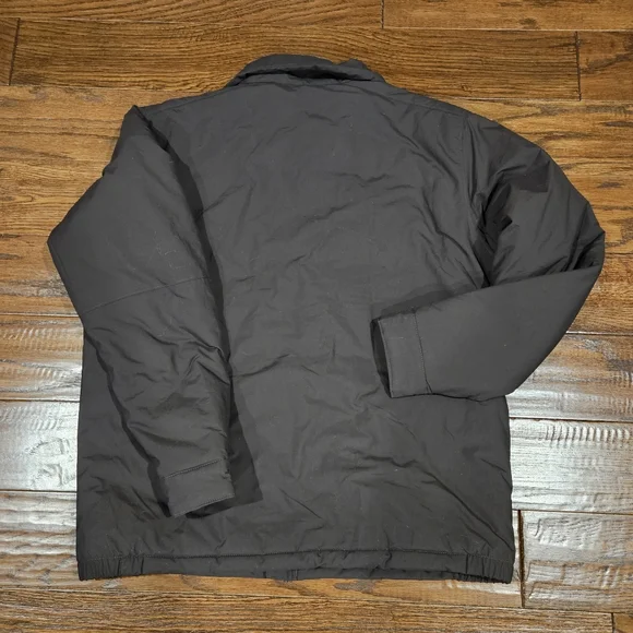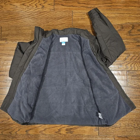 COLUMBIA Men's Nylon Outer, Fleece Lined Insulated Jacket, Dark Olive Green - LWater Resistant Nylon Outer Shell; 80g Microtemp Insulation with Fleece Lining; Machine Washable; Zipper Closure and Zipper Outside Pockets and Inside Pocket; Adjustable Snaps on CuffsVery Gently Worn, In Excellent Condition