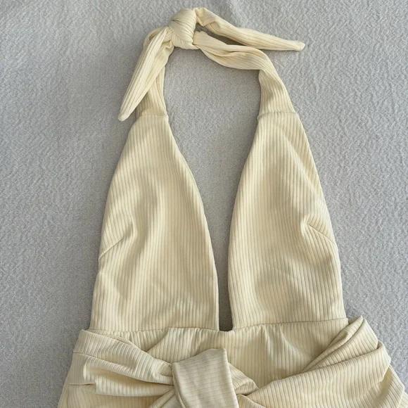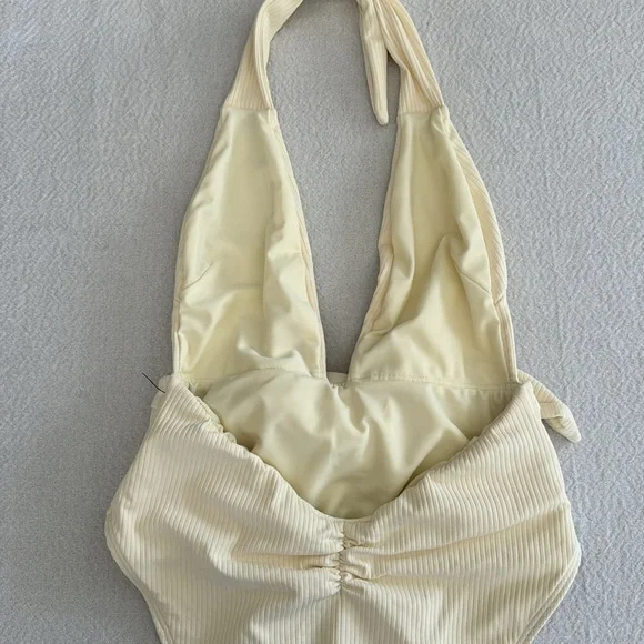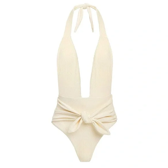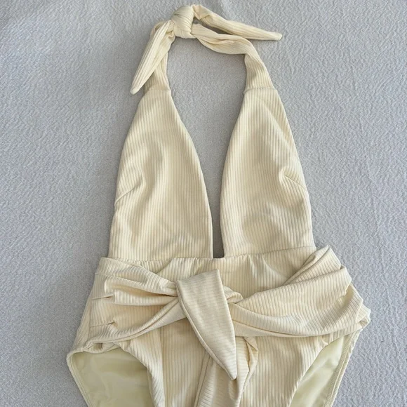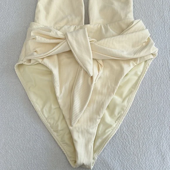 Fit• Light Support• Moderate Bottom Coverage• Thick Straps For Added Comfort• High Cut Style To Elongate Leg• Ties At The NeckStyle Features• Deep Plunging Neckline• Open Back Feature• Oversized Self Tie Bow At Waist (Not Removable)Fabric Details• Solid, Neutral Cream Hue• Buttery Soft Ribbed Material• Extra Stretch Knit Rib That Fits Amazing On The Body• Nylon/Spandex Blend• Fabric Imported From BrazilBrand new no original tag0182