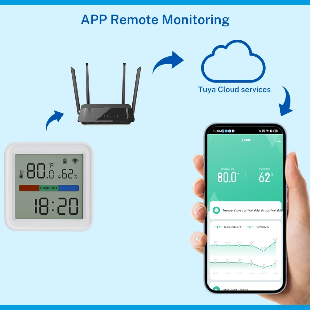 After the configuration is completed, you can view the temperature and humidity on the screen and APP at the same time. And the APP can be effective anywhere in the world