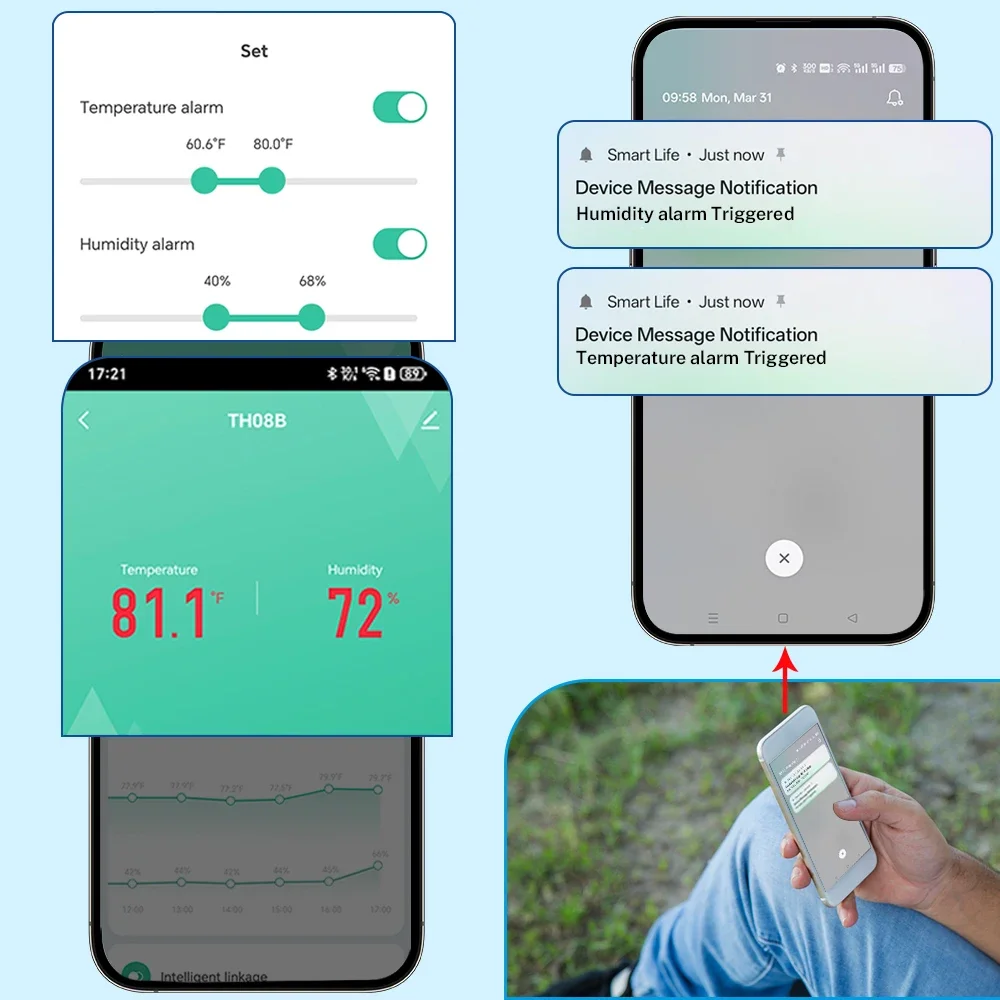 You can preset the range for the temperature and humidity in the Scene page, when the temperature or humidity reaches the range,you will receive alarm message on mobile.