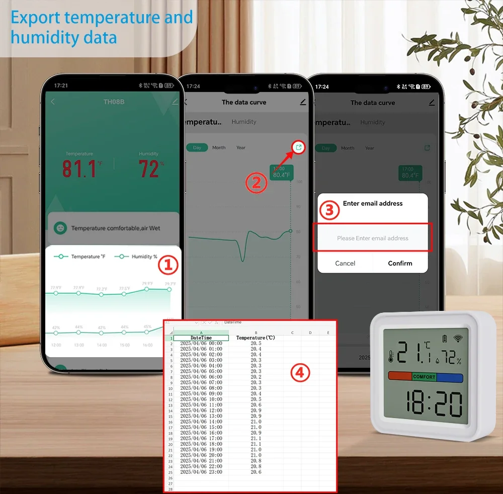 You can view the historic curve of the temperature and humidity in the APP,and export to your email address.