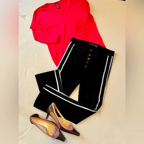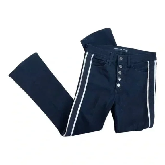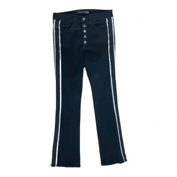 Boot cut and cropped are back in for fall! Veronica Beard Black Carolyn Boot Cut Cropped Tuxedo Striped JeansButton flyBlack and silver tuxedo stripe at side5-pocket styling.Cropped and slightly boot cutBarely worn with no holes/stains/etcSize 25Approx flat measurements: Waist 13.5 inchesRise 10inches Inseam 26 inchesOffers welcome!